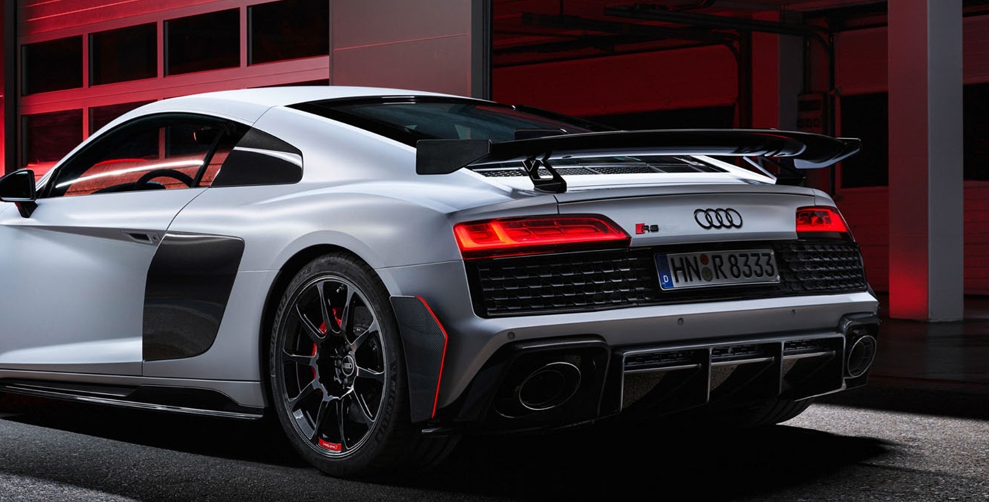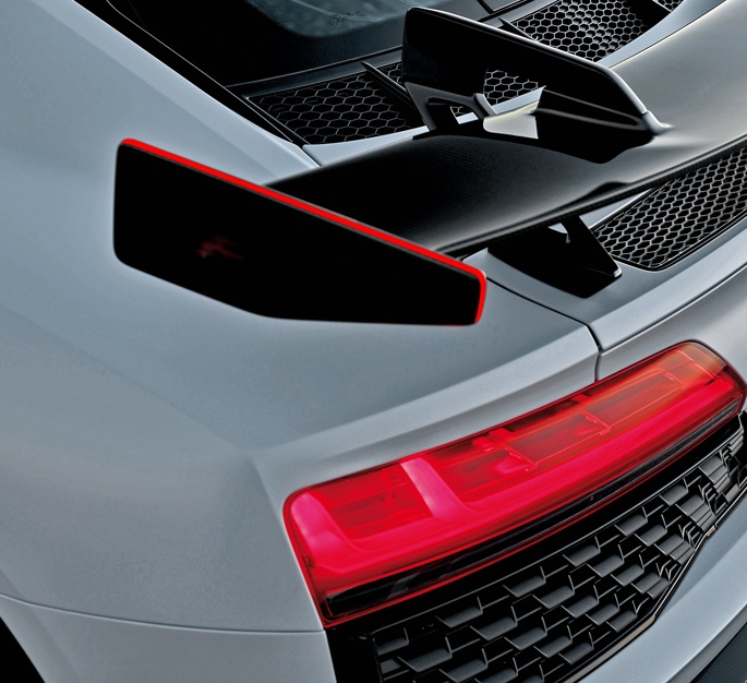 Die Geometrie von Frontspliter und Flics sowie die hängende Geometrie und die seitlichen Endplatten des Heckflügels sind vom R8 LMS GT4 inspiriert.